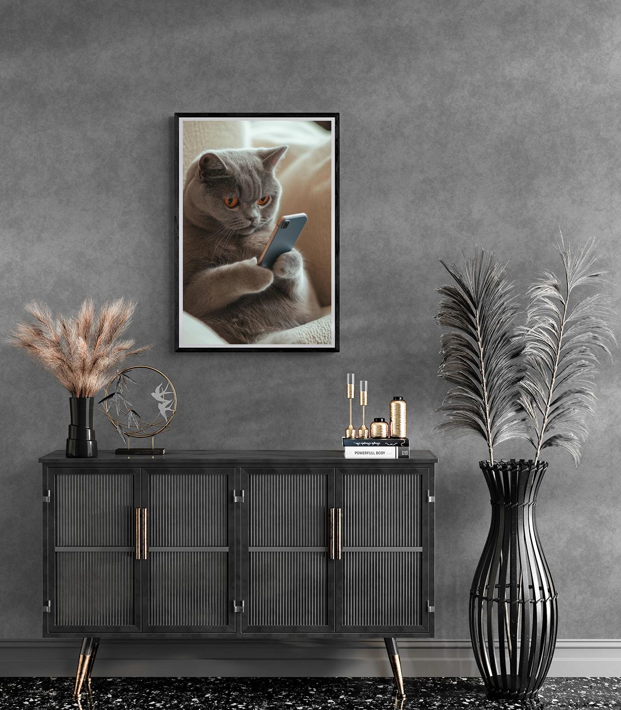 Dieses Cat Phone- Poster verleiht Ihrem Raum einen verspielten und modernen Look, ideal für Katzen- und Technikliebhaber.