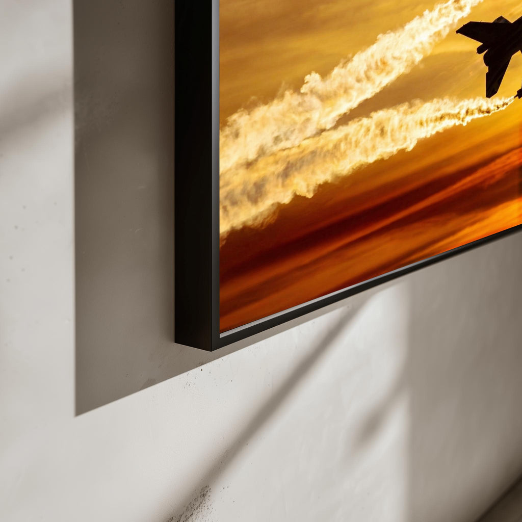 The Jet Fighter Tracks Poster adds a modern and dynamic look to your living room. The airplane tracks bring a sense of adventure and speed.
