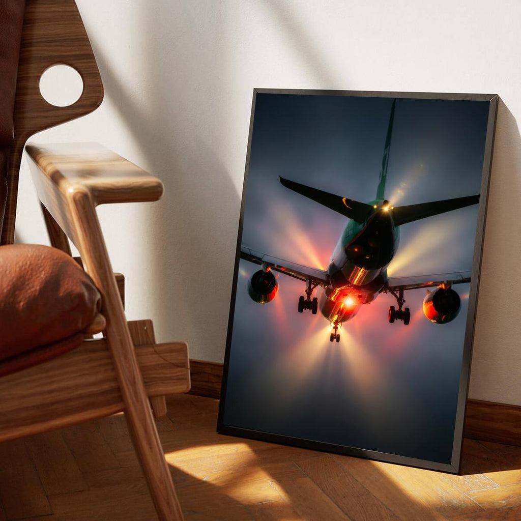 This Airplane Bottom poster adds a modern, airy element to the living room. The detailed image and cool colors fit perfectly with a contemporary interior.