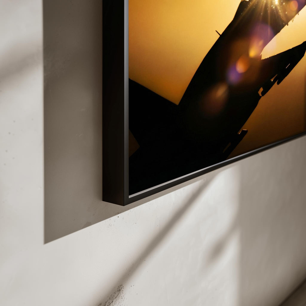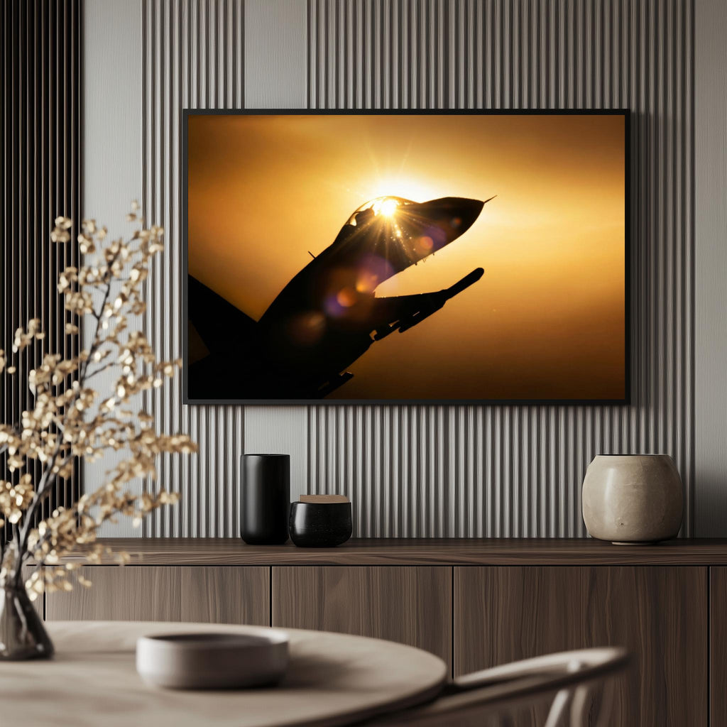 De Straaljager in zon poster is perfect voor de woonkamer vanwege zijn levendige kleuren en unieke ontwerp. Het zal een vleugje moderne kunst toevoegen aan uw decoratie, waardoor het een echte eyecatcher wordt in de ruimte.