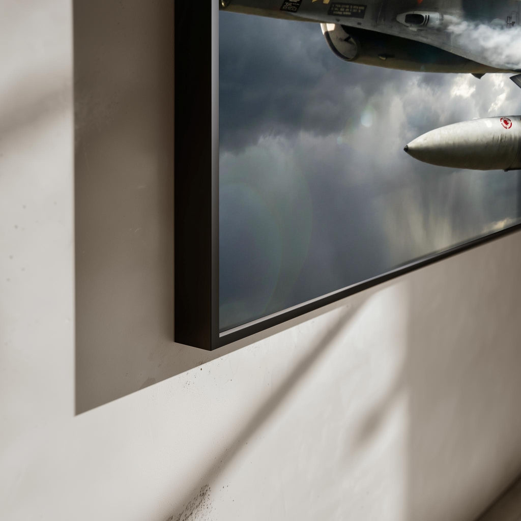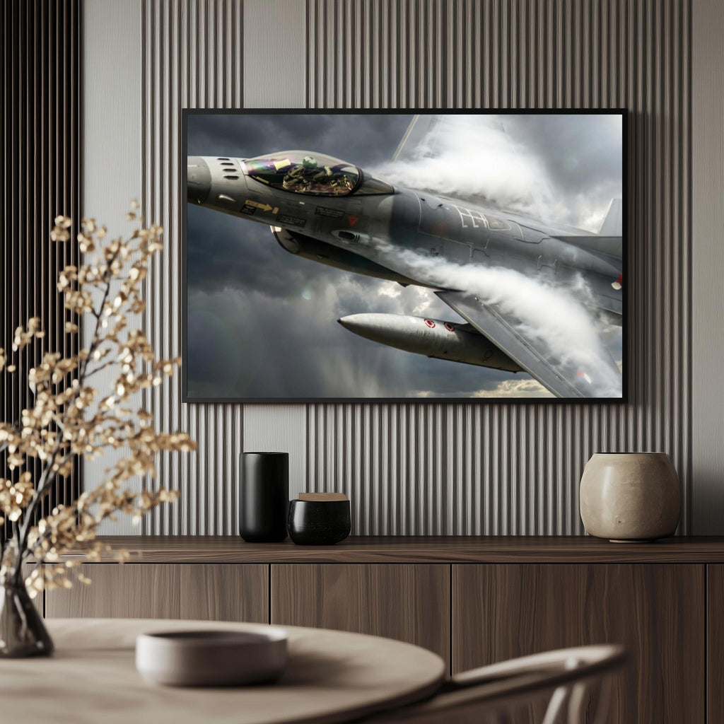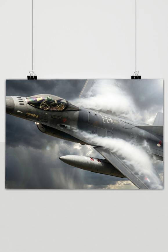 Deze poster zal perfect passen in een stoere kamer en een echte eyecatcher vormen. De gedurfde afbeelding van een straaljager met een raket zal de ruimte een dynamische uitstraling geven.